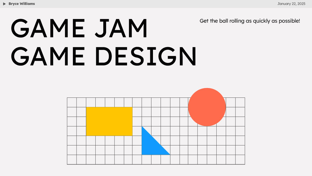 Initially requested for a series of short talks aligning with the 2025 Global Game Jam, I designed the Game Jam Game Design talk as a brief primer of the mindset to get into when joining a game jam for the first time.It goes over everything from what to expect when joining, how to approach ideas and mechanic design, knowing limits and smaller tips and tricks. I'm always working on the presentation and slides, as I hope it to be a consistent source of encouragement for everyone to give their first game jam a chance.