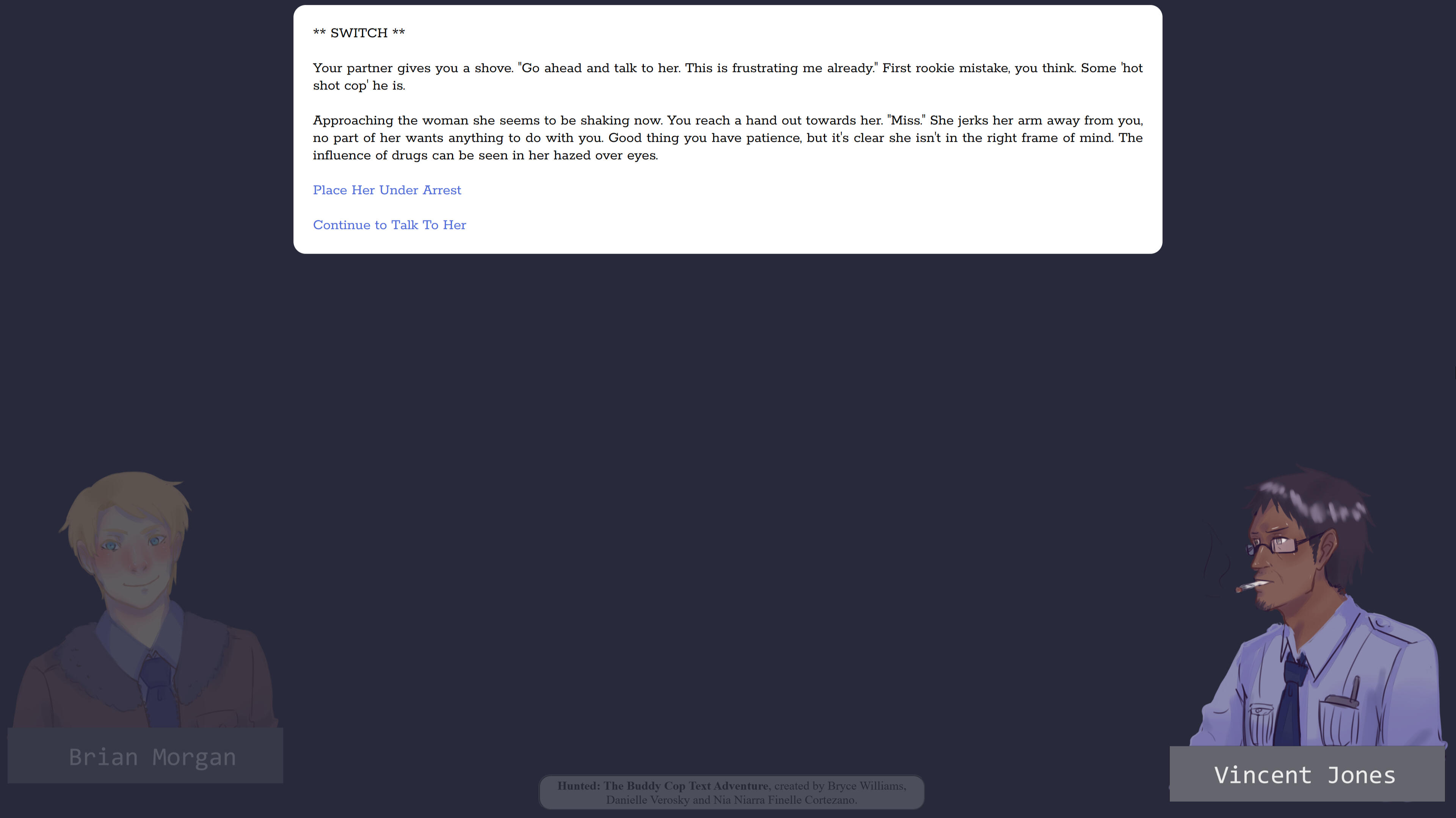 Hunted is a small co-operative text adventure game made in Twine, taking inspiration from 80's & 90's 'buddy cop' movies. Two players take turns playing as different cops as they solve a murder case. Certain decisions made by one player can affect the case, without the other player knowing until the aftermath.Designed as a student project, I was the main programmer. I also wrote some of the dialogue while we split design duties evenly between the three person team.
